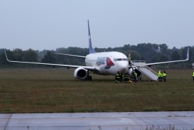 25.08. Letoun sjel z dráhy a stojí několik desítek metrů za drahou.